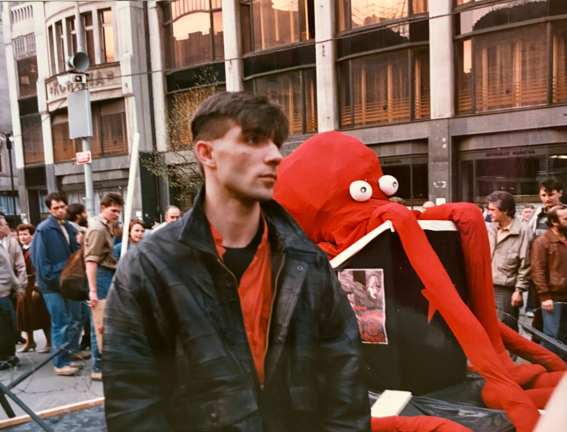 Tomáš na Václavském náměstí v roce 1990 na happeningu k premiéře filmu Fera Feniče Zvláštní bytosti,